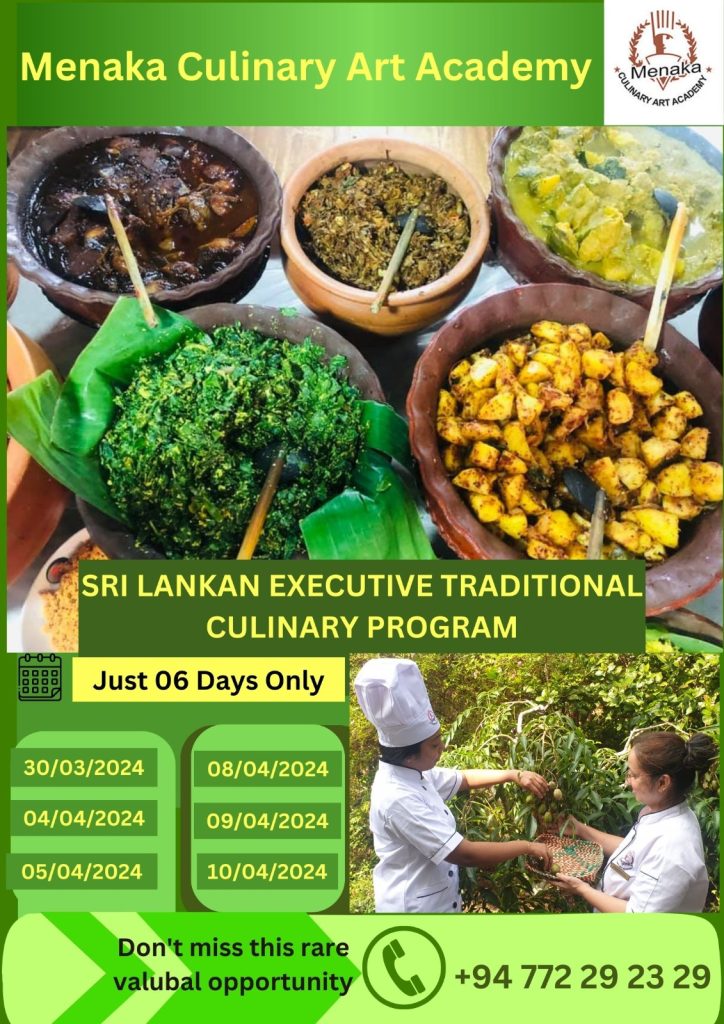 We are contacting you to introduce you to our SRI LANKAN EXECUTIVE TRADITIONAL CULINARY PROGRAM at MENAKA CULINARY ART ACADEMY, 23/52, Pagoda Road in Nugegoda, Sri Lanka.